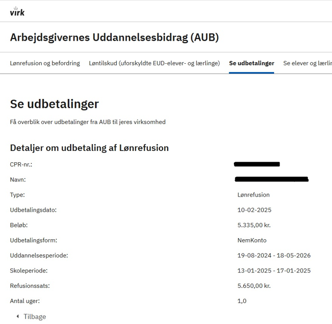 Skoleuger: Kopi af dokumentation fra AUB, der viser udbetalingen for skoleuger.